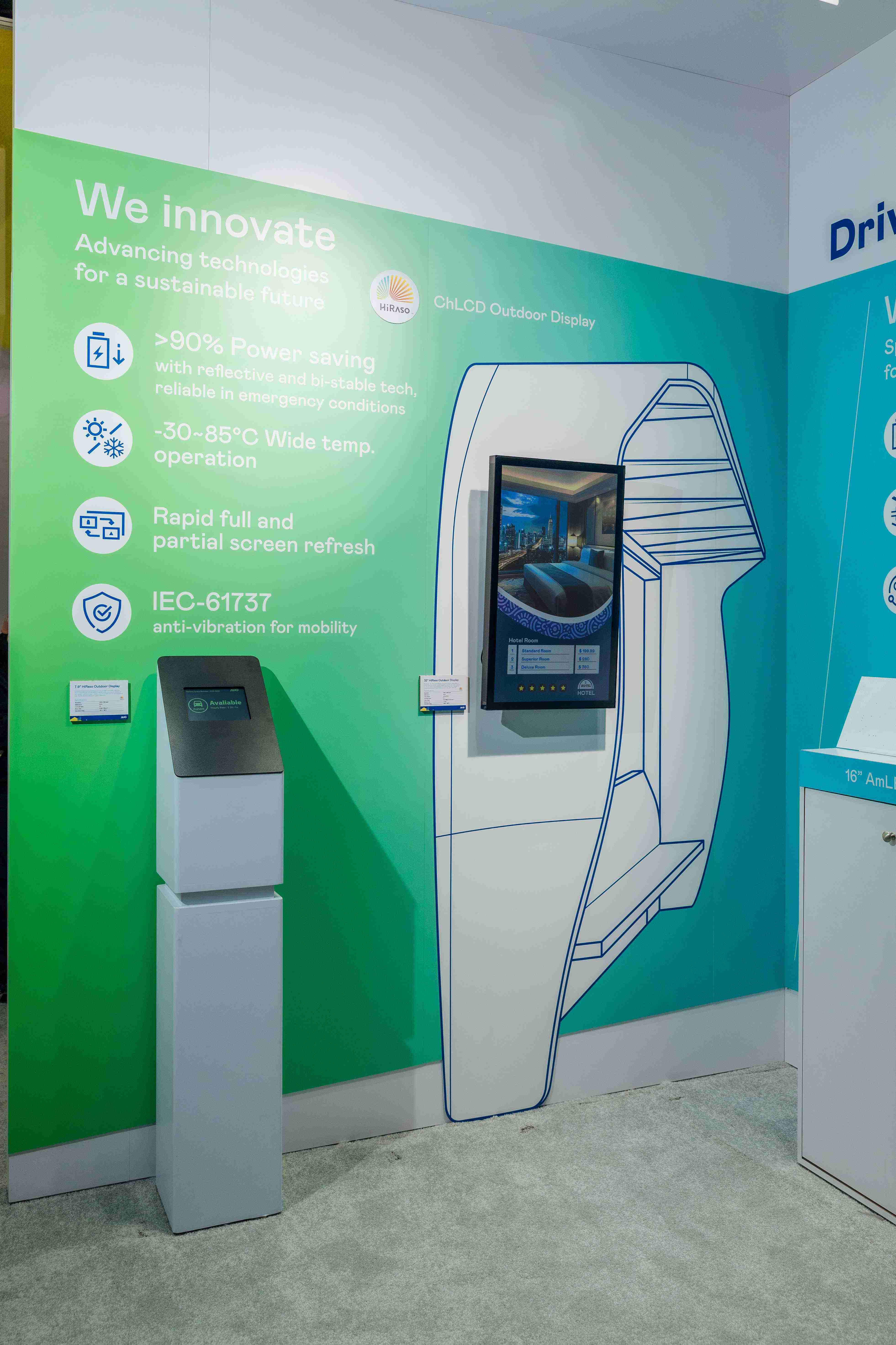 HiRaso胆固醇液晶显示器运用反射环境光线的方式,,呈现影像显示时零耗能的环保省电诉求,,,光线愈强愈能呈现绝佳的色彩饱和度及显示效果,,,同时在摄氏-30度至85度间宽温的使用优势,,,为户外电子看板的新首选。。。