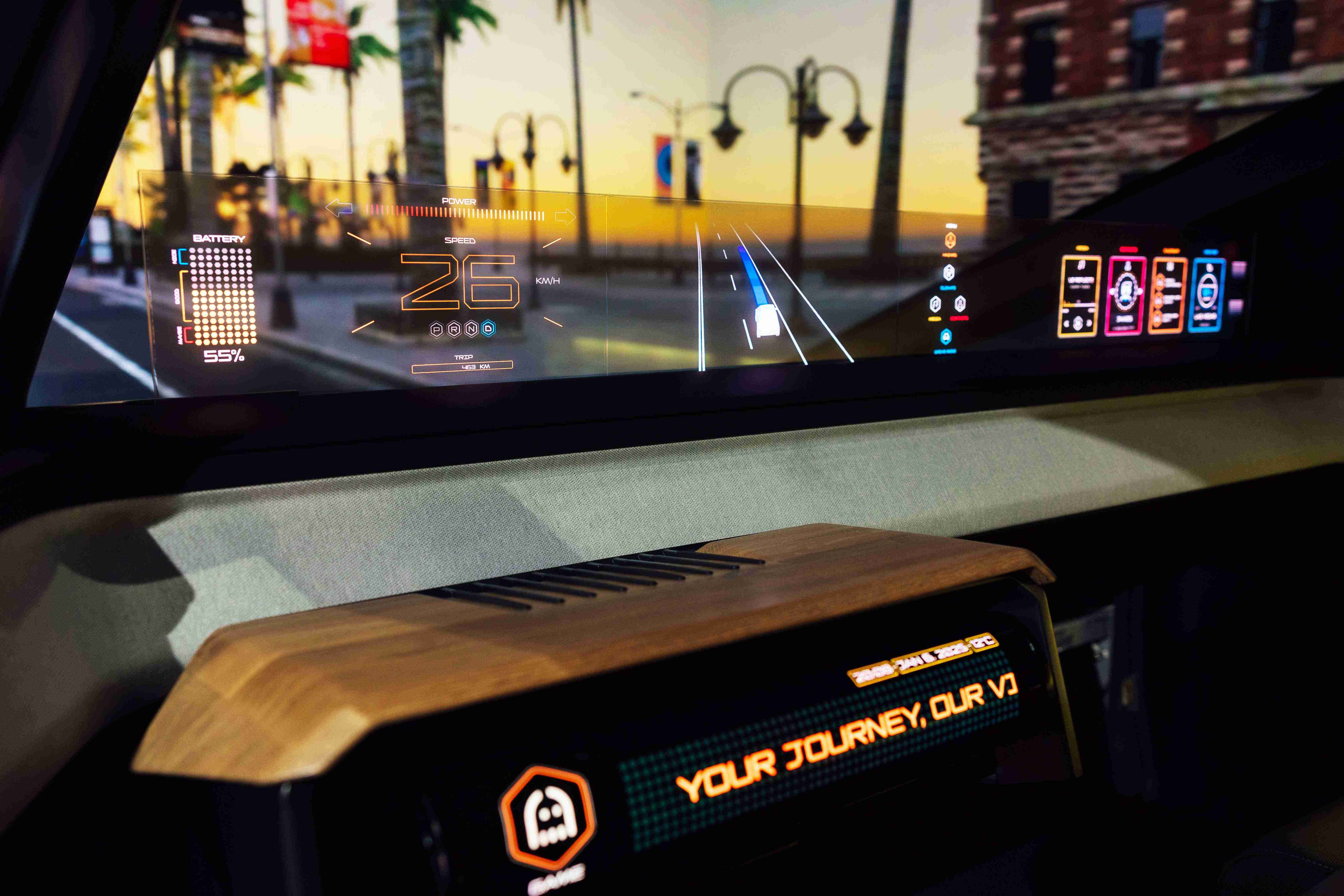 车用运算方案驱动无界透明显示介面(Horizon Image Glass),,整合仪表板、、中控及副驾显示功能为一体式全景呈现,,,不仅提供清晰的外部视野,,亦能即时显示车辆状态、、、、导航及路况资讯,,,,并赋予个性化设定与驾驶安全警示等加值化服务。。。。