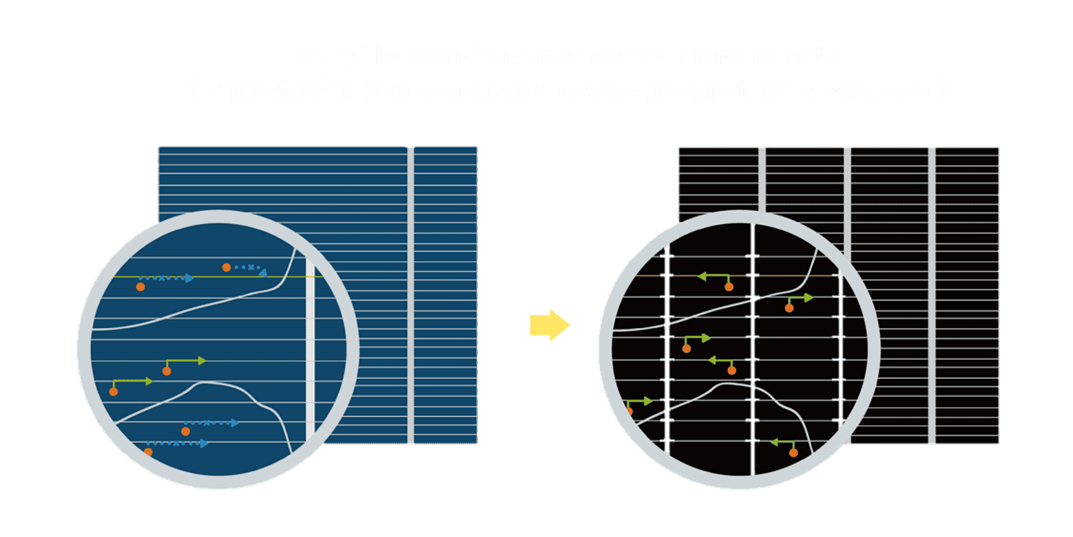 - 电池使用多条铜导线 (Copper wire) 于电池片上形成较短的电流路径,,,,提高电流收集效率,,采用圆形设计的铜导线较传统扁平式的铜焊带 (Ribbon),,,,可增加入射至电池的光线量。。。